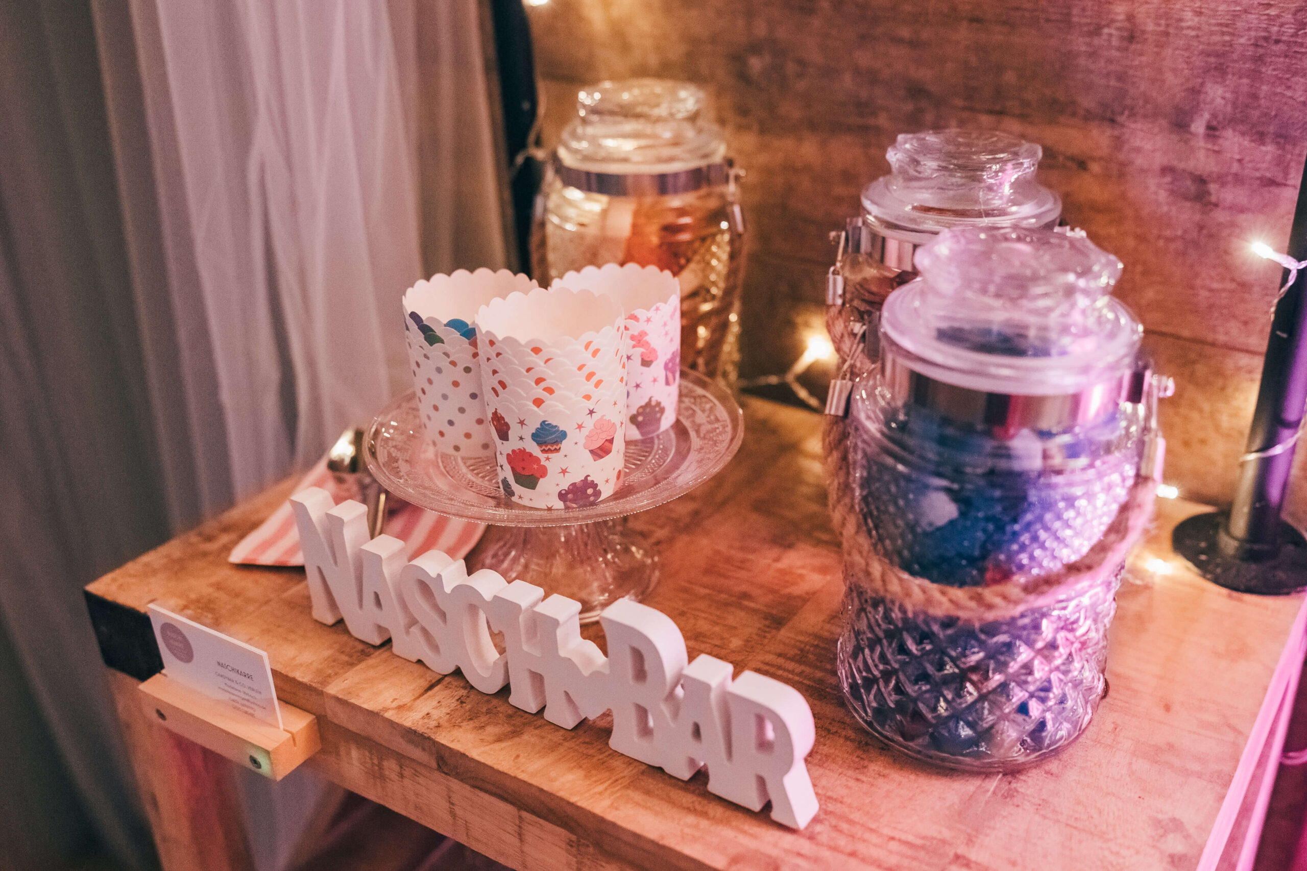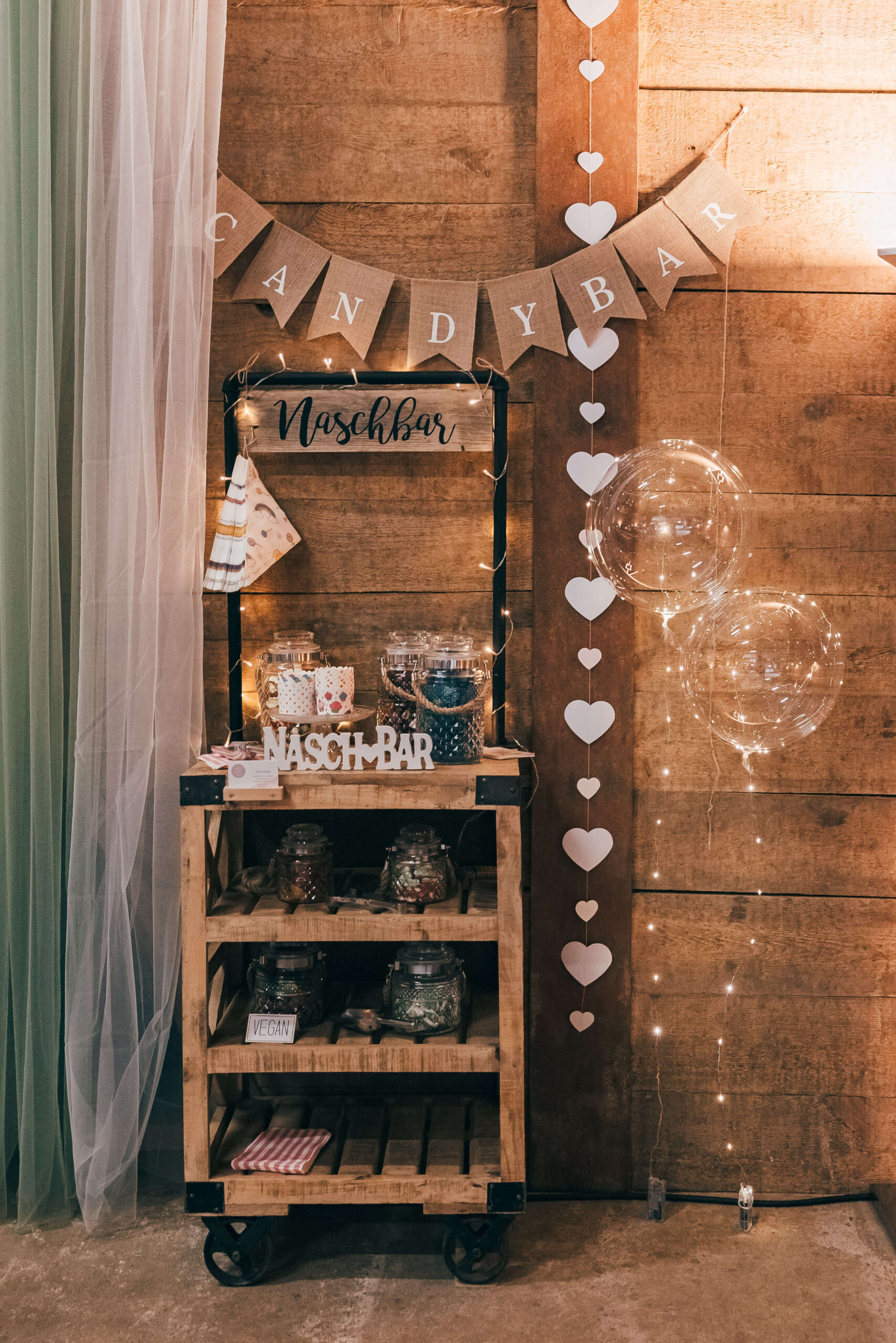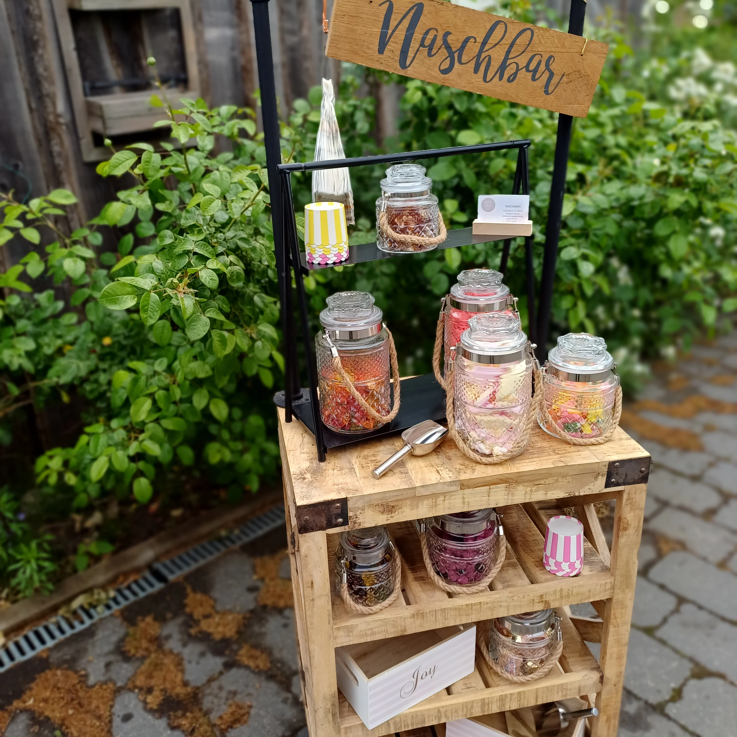 Nicht klassisch, aber immer ein Hingucker: Diese Candybar im angesagten Industrial Design bringt stylisches Flair auf euer Event. Gläser und Deko sind bei der Miete inklusive – einfach aufstellen und genießen.