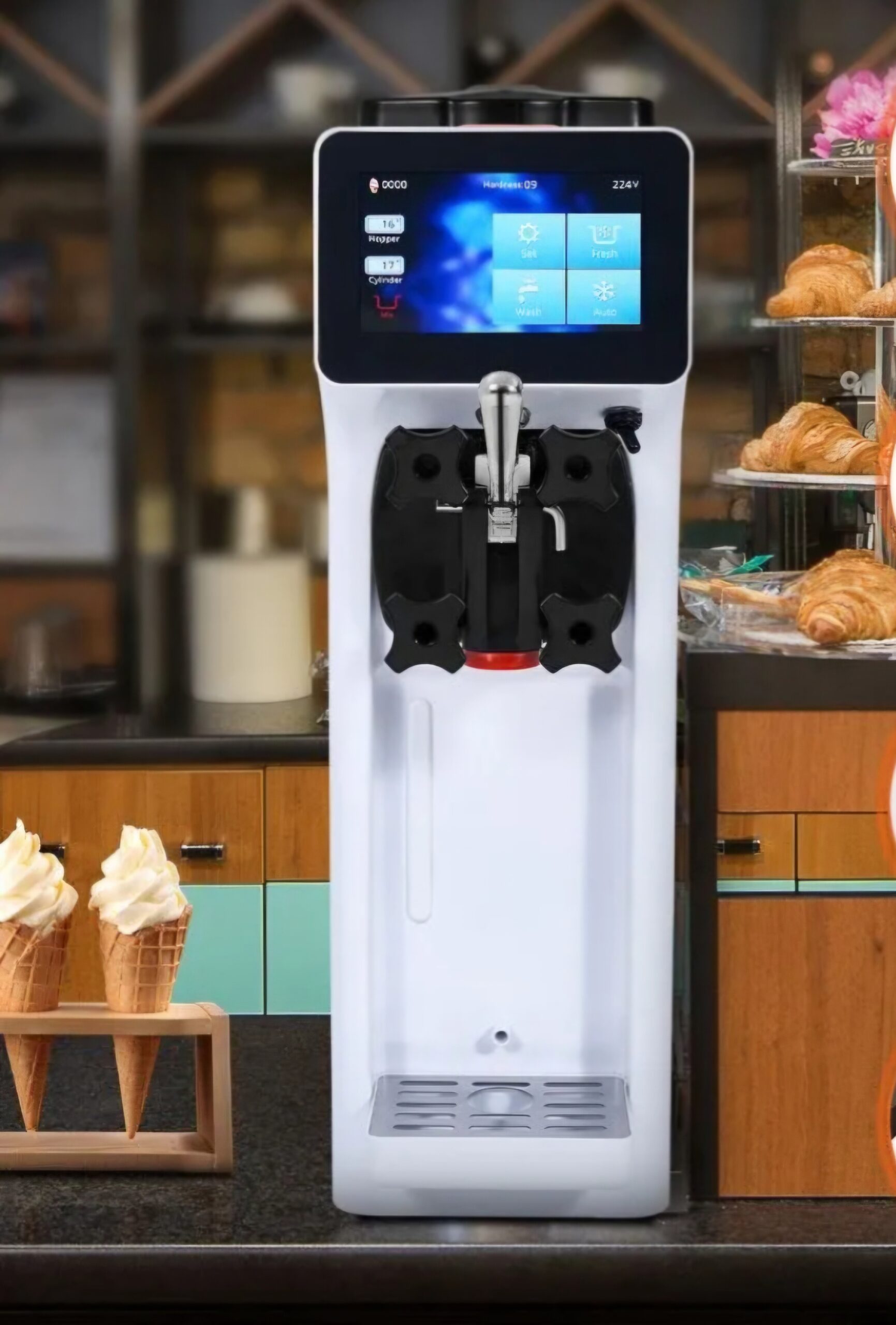 Der süße Höhepunkt auf deinem Event – Mit der hochwertigen Softeismaschine genießen eure Gäste frisches, cremiges Softeis in verschiedenen Geschmacksrichtungen. Ob Firmenfeier, Geburtstag, Hochzeit, Sommerfest oder Messe – die Softeismaschine ist leicht zu bedienen, zuverlässig und sorgt garantiert für ein Highlight. Die Maschine eignet sich eher für kleinere Veranstaltung, Die Softeismaschine macht ca. 4 Portionen, danach kühlt die Maschine und nach kurzer Zeit können wieder neue Portionen gezapft werden.